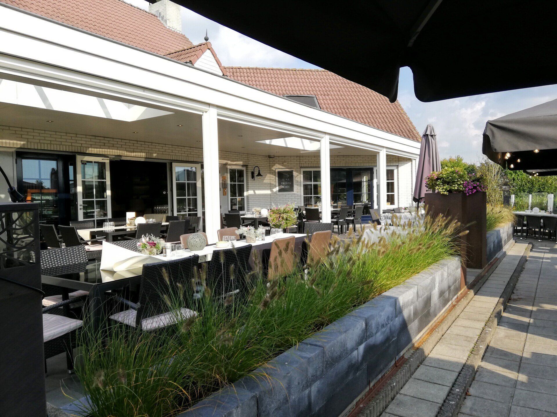 Bij onze rondleiding moest ik constateren dat dit een geweldige mooie zaak is met nog veel meer mogelijkheden. Het mooie witte pand staat trots en fier centraal op het golf terrein. Bij aankomst zien we als eerste, na geparkeerd te hebben op een ruim parkeerterrein, de imposante trap naar het restaurant. Bij binnenkomst proef je direct de sfeer, beetje koloniaals, mooi klassiek, maar een heel gemoedelijke stijl. Links is de ruime bar met daarachter een goed geoutilleerde keuken, van alle gemakken voorzien. De gebruikte inventaris, bevind zich in een topconditie! Voorbij de bar is een restaurantgedeelte met een 40 tal zitplaatsen. Bij binnenkomst rechts zijn diverse stijlen gebruikt om mensen de ruimte te geven gesprekken te voeren en te chillen. Mooie tafels met ruime stoelen maar ook fauteuils bij de openhaard. En dan loop je door naar het terras. Wow, 150 zitplaatsen met uitzicht op de dak van Brabant en midden tussen de golfbanen. Je voelt je direct gearriveerd op je vakantiebestemming. Wat een mooie plek!!