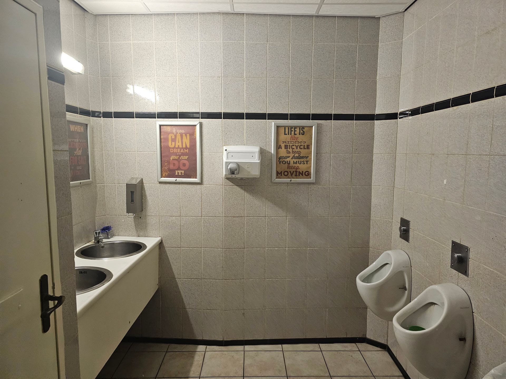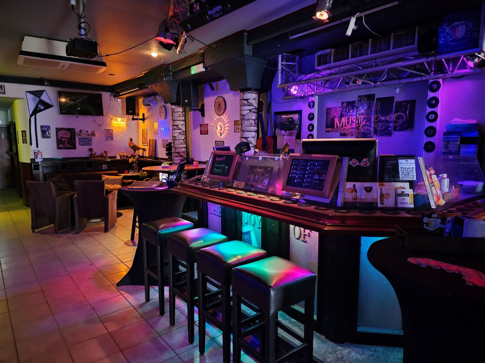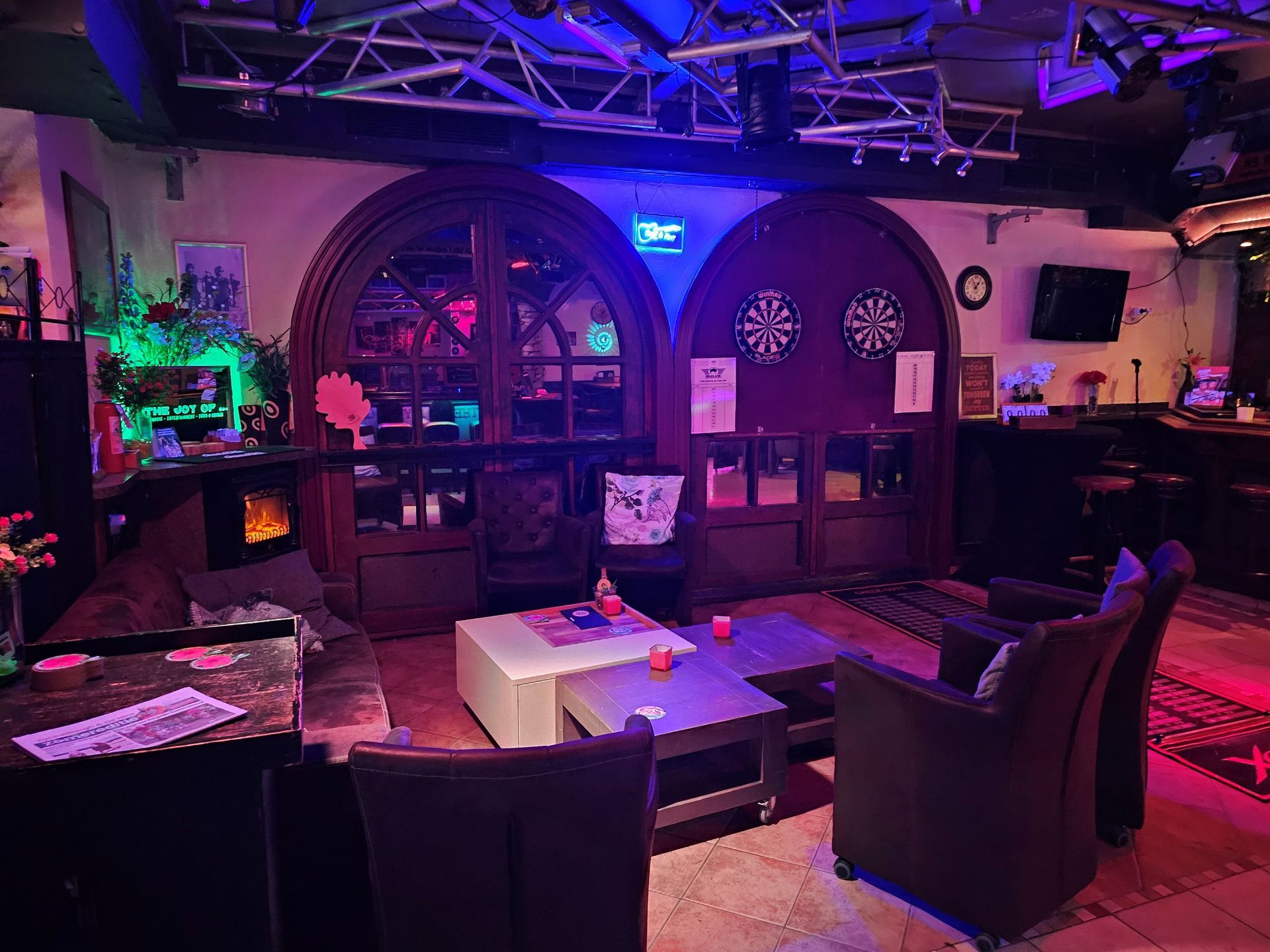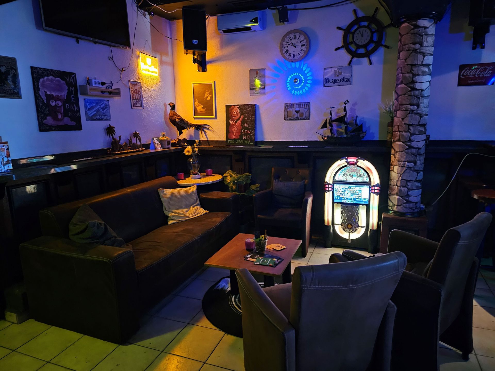 De inventaris van het café is goed gebruikt maar biedt talloze mogelijkheden voor vermaak en ontspanning.