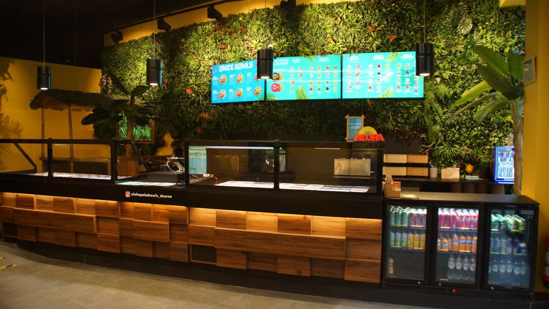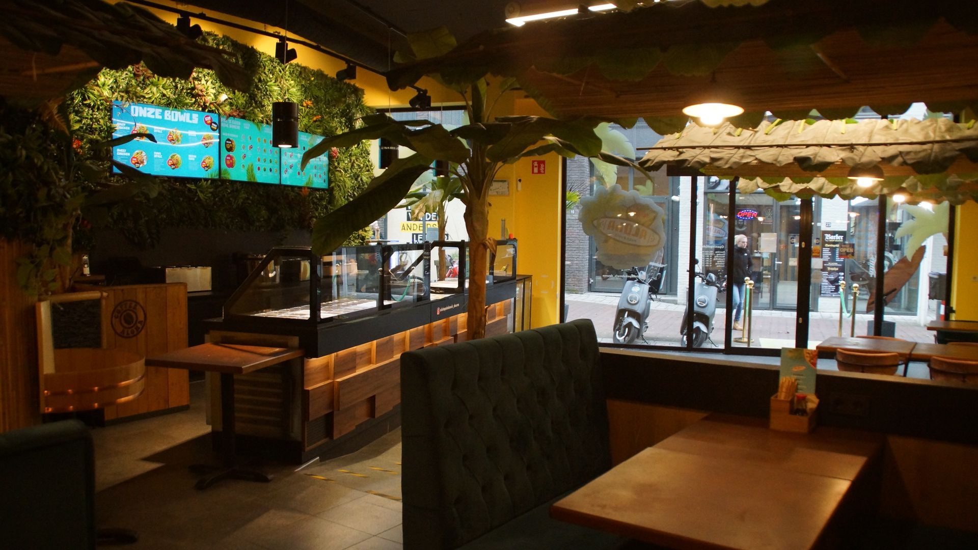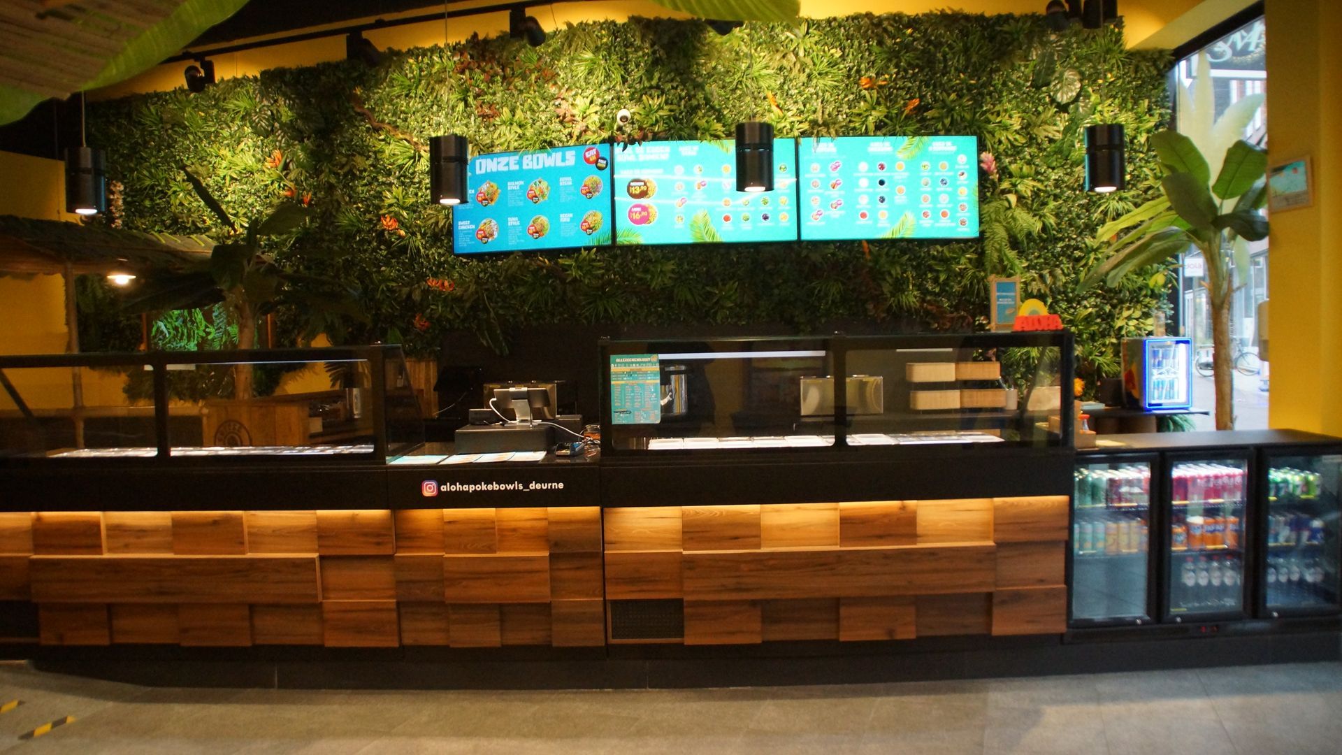 Bij het betreden van Aloha Poke Bowls waan je je voor even in een andere wereld. Uitnodigende tafeltjes met daarboven bamboe en een dak van bananenbladeren, op de achtergrond tonen schermen de Hawaïaanse zonsondergang aan het strand. Deze schermen kunnen ook gebruikt worden voor speciale persoonlijke boodschappen als er iemand jarig is of bij andere gelegenheden. De moderne bar waar de ultragezonde maaltijden bereid worden, lijkt midden in de jungle te staan.