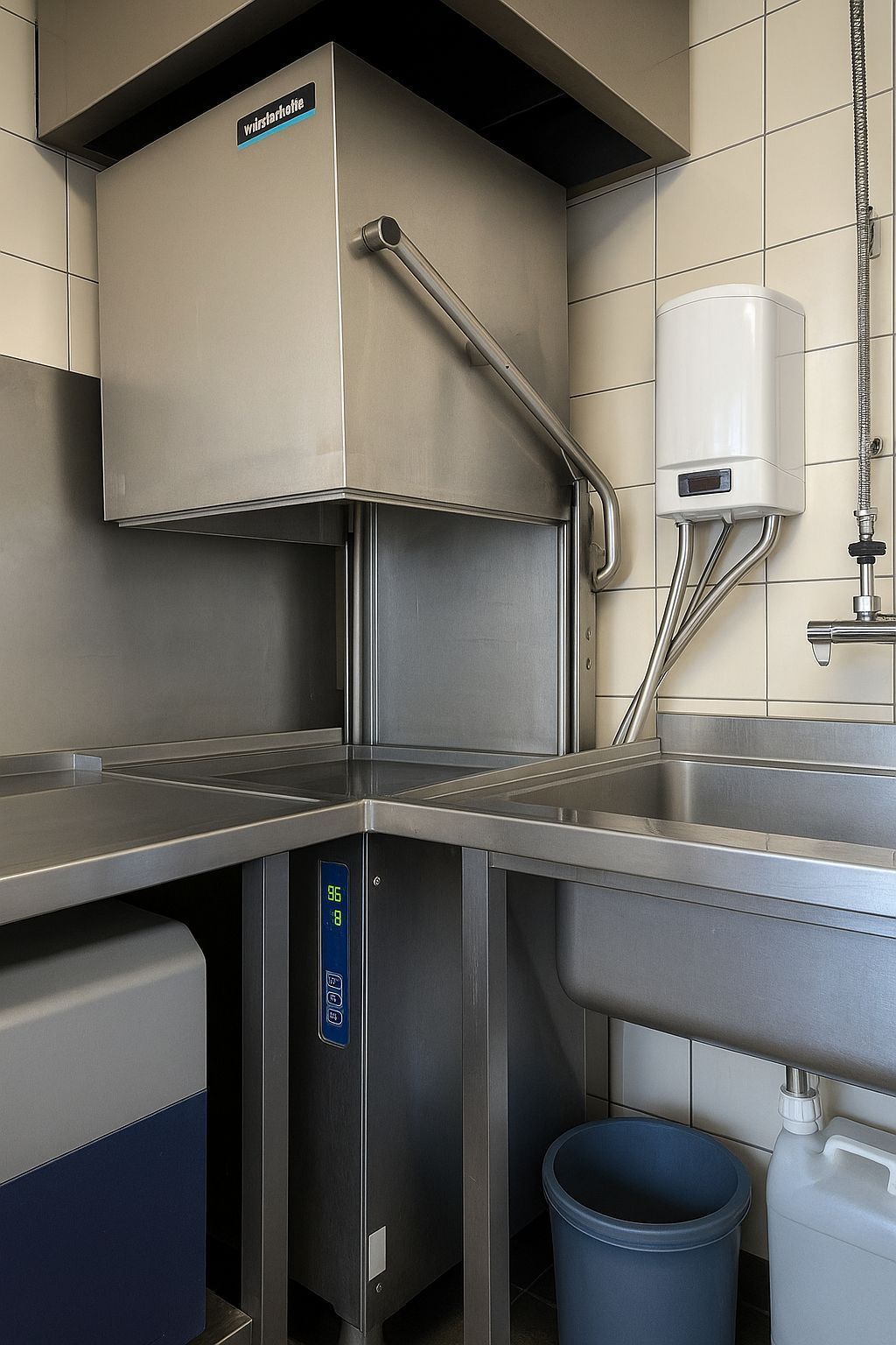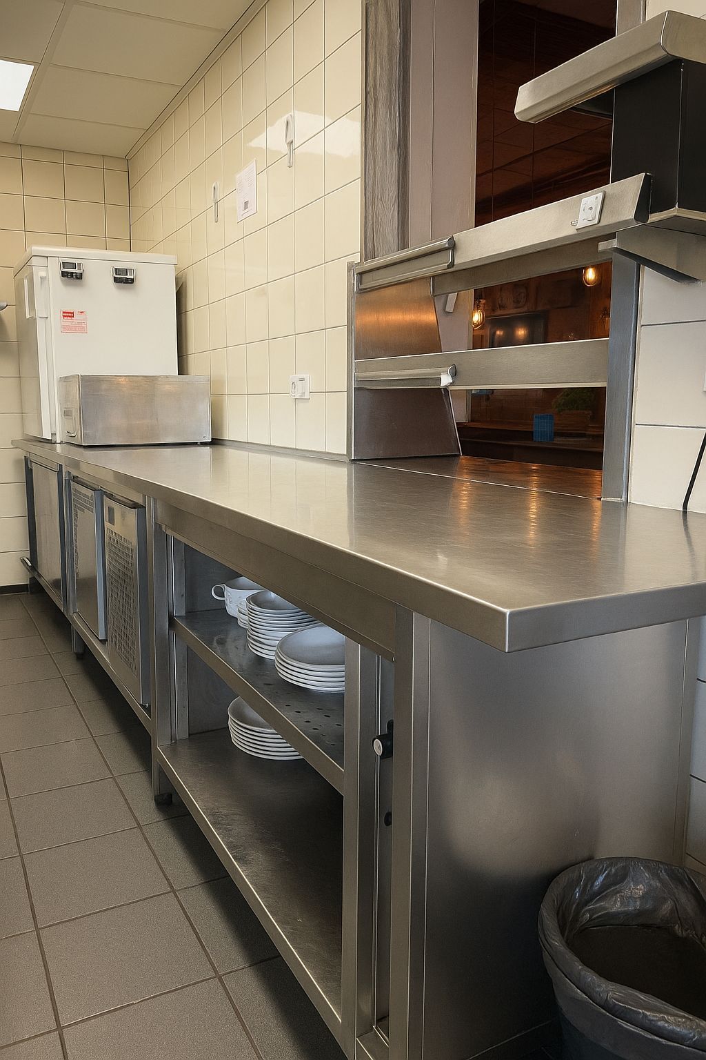 De volledig uitgeruste horecakeuken beschikt over o.a. een dubbele grill, combi-oven, 4 gaspitten, 2 ingebouwde friteuses, ruime werkoppervlakken en een professionele vaatwasinstallatie. Aangrenzend bevindt zich een grote bijkeuken met inloopkoeling, personeelstoilet, personeelsruimte en voldoende opslagstellingen.